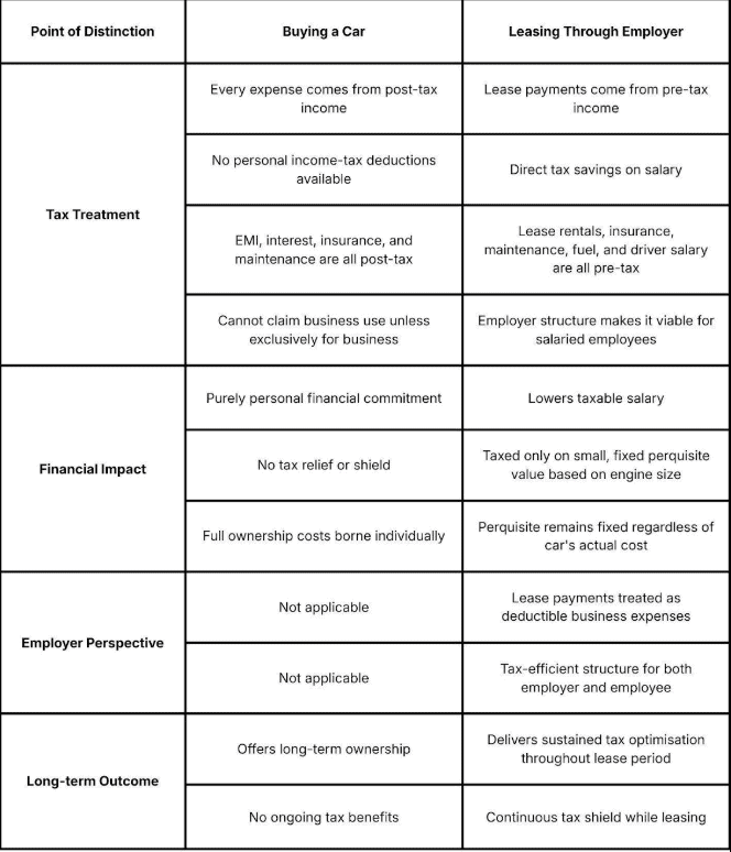 Leasing keeps cash flow lighter because there’s no big down payment and no personal loan EMIs. The employee only pays a predictable monthly rental, usually through pre-tax deductions, which softens the impact on take-home salary.